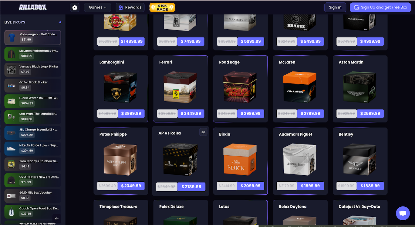 - Marketing Suggestion: The platform tends to theme more expensive boxes around luxury goods (e.g., “Rolex Box”), which creates the impression that higher spend = higher chance of a high-end win.